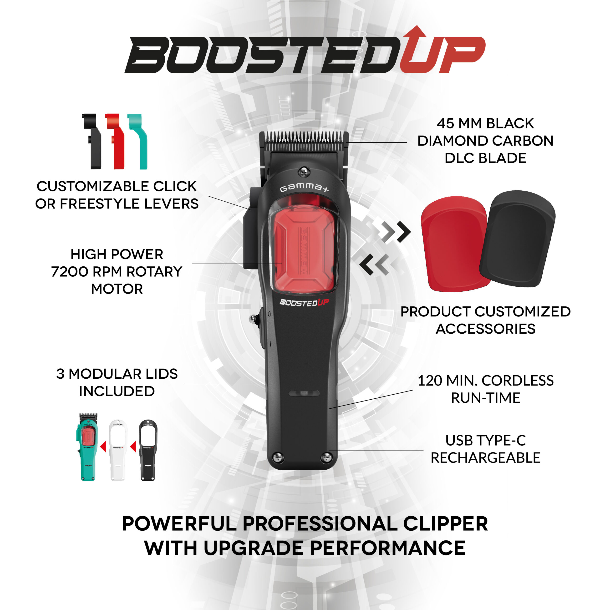 Gamma+ BoostedUP Clipper | Tagliacapelli Professionale con prestazioni elevate e 3 cover intercambiabili
